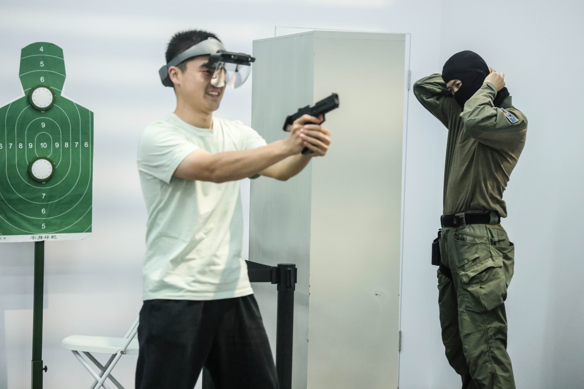 參觀人士在試用手槍