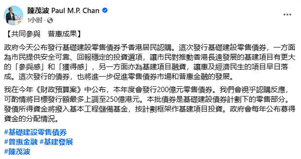 香港政府擬發行200億港元基礎建設零售債券 保證息率3.5厘分享到: