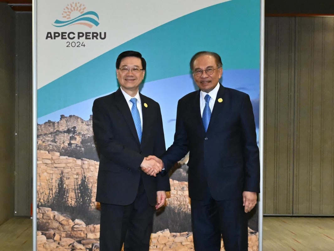 李家超與馬來西亞總理安華會面。李家超FB圖片 此外,李家超很高興於APEC會議期間與馬來西亞總理安華會面,恭賀馬來西亞擔任東盟2025年輪值主席國,期待未來跟馬來西亞政府緊密合作,繼續促進香港及東盟的聯繫及協作。他亦感謝馬來西亞支持香港計劃於吉隆坡增設經濟貿易辦事處,而此將會是香港於東盟地區設立的第4個經貿辦。 李家超表示,香港跟馬來西亞擁有緊密貿易關係,除了馬來西亞是香港於東盟的第3大貿易夥伴,雙邊貨物貿易額亦達239億美元。香港和馬來西亞擁有穩健及互惠互利的經貿關係,期待於各個層面增進跟馬來西亞的人才交流。(完) 【編輯:豐悅】