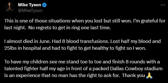 香港新聞網11月17日電 當地時間15日,在美國德克薩斯州阿靈頓AT&T體育館,58歲的傳奇拳王泰森重返擂台,打滿8回合不敵27歲拳手傑克-保羅。泰森其後在社交平台表示, “這是那種你輸了但也贏了的比賽,我很感謝這一夜,最後一次登台,我沒有遺憾了。”