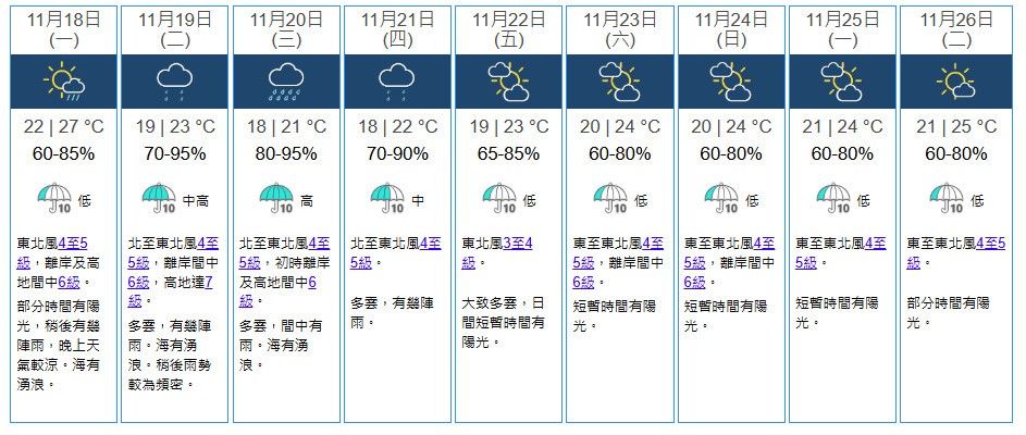 香港地區未來9天天氣預報。香港天文台截圖 香港地區今日天氣預測:部分時間有陽光,最高氣溫約27℃,稍後有幾陣雨,晚上天氣較涼。吹和緩至清勁東北風,離岸及高地間中吹強風。海有湧浪。 未來天氣展望:未來一兩日風勢頗大,海有湧浪,天文大潮期間晚上個別低窪地區可能出現輕微水浸。本週中期間中有雨,氣溫進一步下降,最低氣溫在18℃或以下。(完) 【編輯:許豐悅】