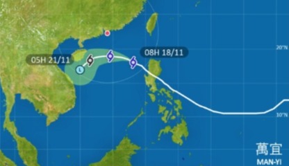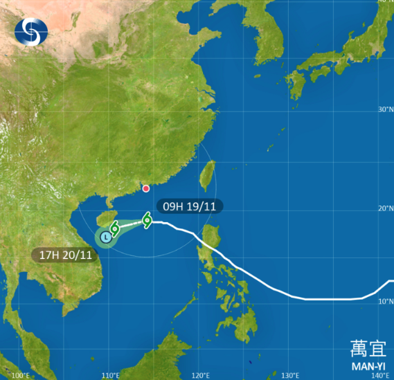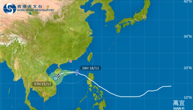 11月19日上午9時,颱風“萬宜”位於北緯 19.0 度,東經 114.3 度。香港以南約370公里。中心附近最高持續風速約每小時85公里。香港天文台截圖 今晨7時45分,香港天文台指出,過去數小時,萬宜繼續以偏西方向橫過南海北部並減弱。現時萬宜最接近本港,在香港以南約400公里內掠過。與其相關的雨帶正影響廣東沿岸,預料本港今日(19日)雨勢有時較為頻密。受萬宜及東北季候風的共同影響,本港今日(19日)離岸及高地間中吹偏北強風,一號戒備信號會至少維持至今天(19日)晚上10時。 受天文大潮、東北季候風及萬宜的共同影響,預料香港沿岸水位在今晚(19日)10時至午夜時分會升得比平常高,維多利亞港的海水高度會上漲至海圖基準面以上接近3米,而大澳的海水高度則會上漲至海圖基準面以上約3.1米。個別沿岸低窪地區可能出現輕微水浸,市民請採取適當預防措施。 在今日(19日)上午9時,“萬宜”集結在香港以南約370公里,預料向西移動,時速約18公里,橫過南海北部。預計“萬宜”會在今明兩日橫過南海北部,大致移向海南島以南一帶並逐漸減弱。