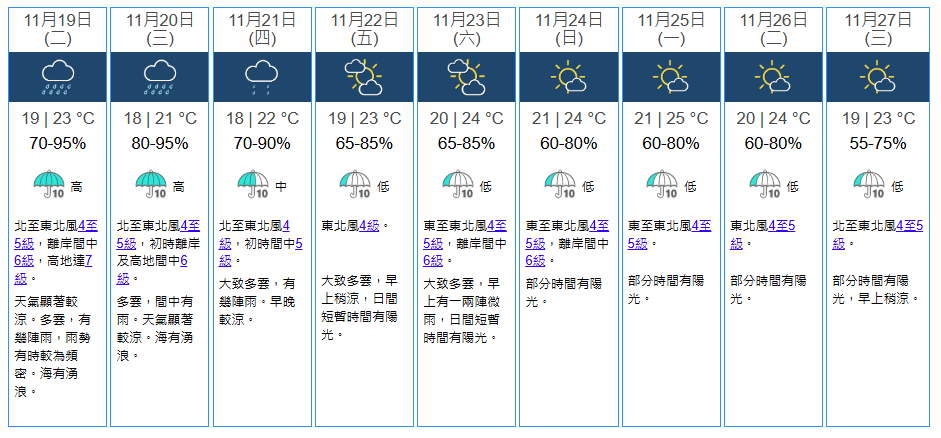 香港地區未來9天天氣預報。香港天文台截圖 本港地區今日(19日)天氣預測:天氣顯著較涼。多雲,有幾陣雨,雨勢有時較為頻密。日間氣溫徘徊在20℃左右。吹和緩至清勁北至東北風,離岸及高地間中吹強風。海有湧浪。 未來天氣展望:明日(20日)間中有雨,天氣仍然較涼。星期四(21日)風勢緩和。本週後期天色較為明朗,日間氣溫稍為回升。(完) 【編輯:豐悅】