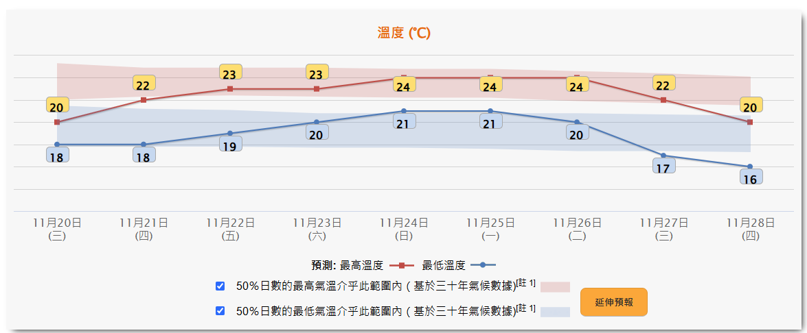 香港地區未來9天氣溫預報。香港天文台截圖