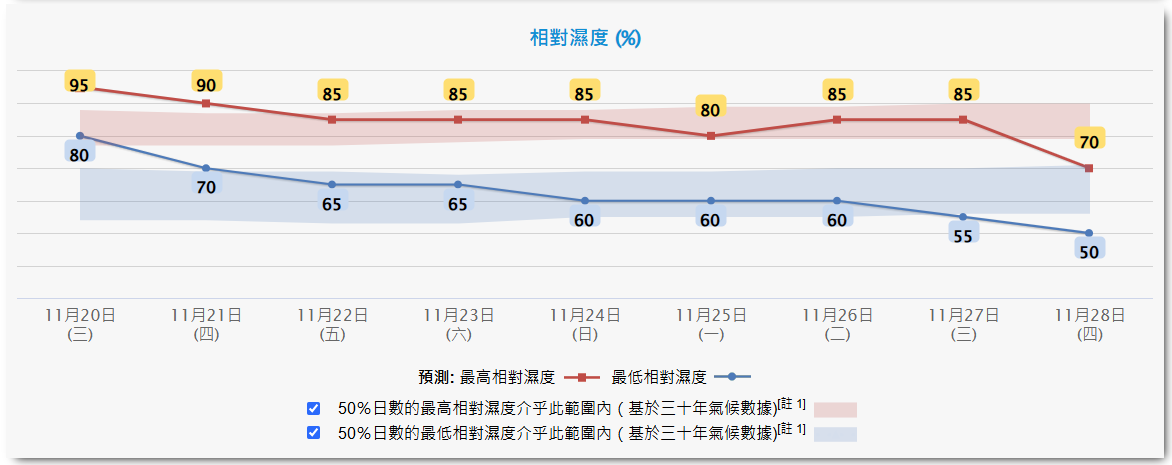 香港地區未來9天濕度預報。香港天文台截圖 未來天氣展望:未來一兩日早晚仍然稍涼,日間天色較為明朗。週末期間風勢頗大。(完) 【編輯:豐悅】