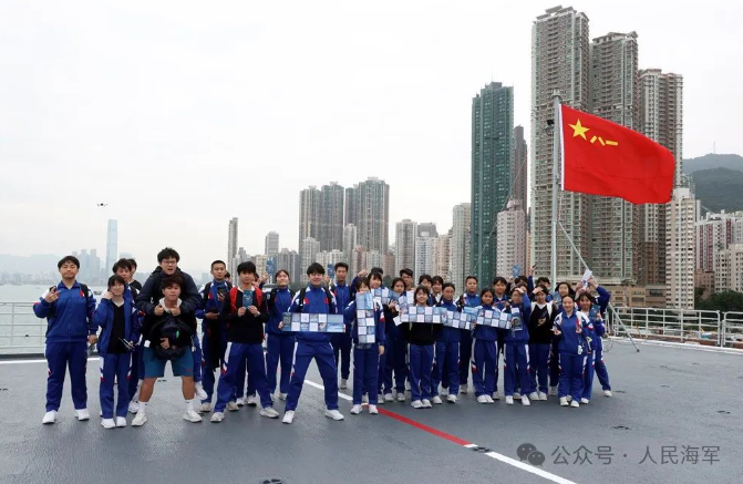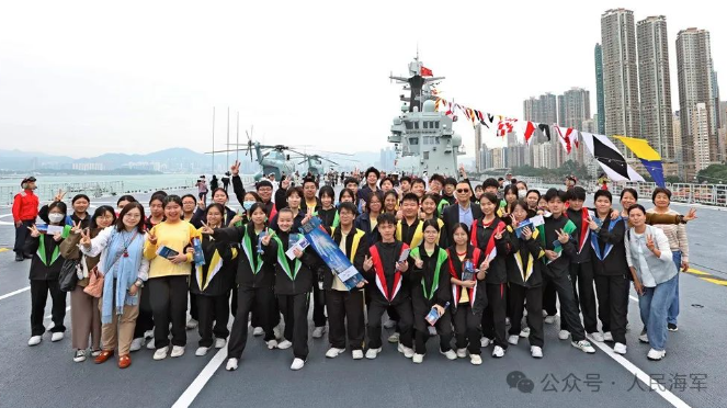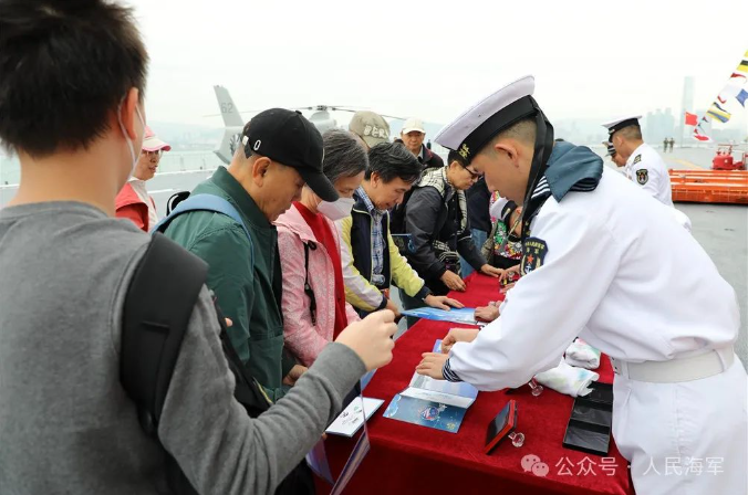 參觀學生團體合影。來源:人民海軍公眾號 雖然昨日天公不作美,但難掩市民們參觀的熱情,招商局碼頭艦艇開放參觀入口於早上8時30分已排起了長龍,他們既有長者亦有學生等不同年齡層面人士。碼頭外圍亦有許多市民在遠處眺望,都希望能近距離一睹大國重器的風采。每名登艦參觀者都收到海南艦的文創產品。 有軍事迷對能夠登上一流戰艦感到興奮,形容是大飽眼福,為祖國擁有強大戰力的現代化軍艦感到自豪和驕傲。