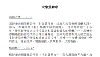 香港舉行年度授勳典禮 5位知名人士獲頒大紫荊勳章分享到: