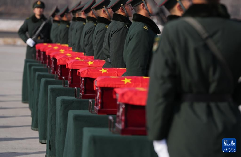 11月28日,在瀋陽桃仙國際機場,禮兵將殮放志願軍烈士遺骸的棺椁從專機上護送至棺椁擺放區。新華社記者 李鋼 攝 在瀋陽桃仙國際機場,一名烈士的女兒帶著父親的手帕和照片,來到機場迎接在韓志願軍遺骸回國。一名烈士遺屬向媒體表示,自己為找哥哥遺骸曾兩次赴朝鮮,期待烈士陵園有他名字,捧一把土回來放在父母墓前讓他們安心。 當天上午,中韓雙方在韓國仁川烈士遺骸臨時安置所共同舉行第十一批在韓中國人民志願軍烈士遺骸裝殮儀式,韓方對志願軍烈士遺骸進行裝殮,再次向中國移交43位在韓中國人民志願軍烈士遺骸及495件遺物。裝殮儀式後,中韓雙方共同將烈士遺骸棺椁運送至韓國仁川國際機場。 2014年以來,中韓雙方遵循國際法和人道主義原則,坦誠友好、務實合作,已連續11年成功交接981位在韓中國人民志願軍烈士遺骸及相關遺物。(完) 【編輯:丘志彬】