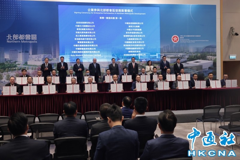 香港中通社11月29日電(香港中通社記者 譚暢)29日,逾80間企業簽署參與香港北部都會區發展意向書。期間,亦有30多間企業簽署32份參與北部都會區開發項目的協議,涉及金額逾1000億港元。 作為香港特區政府規劃的未來重點發展區域,北部都會區面積達三萬公頃,足佔香港面積的三分之一。同時,該區位於香港最北部,與深圳僅一河之隔,佔據地理位置優勢,便利兩地合作往來。 “隨著河套區和其他多個新發展區的建設,北部都會區將成為香港與其他粵港澳大灣區城市高質量合作的新平台。”香港特區行政長官李家超在簽署儀式上表示,相信商界領袖一定能看到北部都會區有一個充滿希望、前景亮麗的未來。 中央駐港聯絡辦主任鄭雁雄致辭時亦指出,北部都會區開發是香港深度參與粤港澳大灣區建設、更好融入國家發展大局的關鍵一招;相信香港工商界定能更加振奮精神、厲兵秣馬、全情投入,把握住北部都會區開發的重大機遇。 參與是次簽署儀式的企業,包括香港四大發展商——長江實業、新鴻基地產、新世界發展及恆基地產,亦有眾多內地央企及國企,如中銀香港、中國中鐵國際、華潤置地等,足見香港與大灣區的聯繫日益緊密。