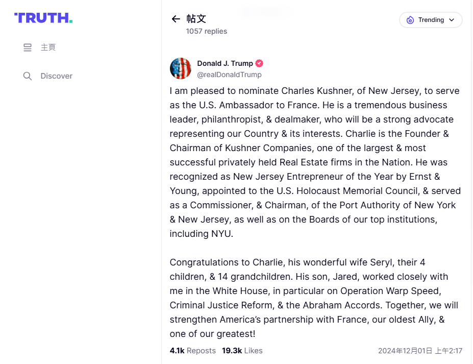 真相社交平台截圖。 公開資料顯示,庫什納今年70歲。2005年,他因拖欠稅款被判入獄兩年。他將給民主黨候選人的捐款記作商業支出。起訴的依據之一是他妹妹埃斯特的證詞,在查爾斯和穆雷的衝突中,埃斯特站在後者一邊。為了報復,查爾斯雇了一名妓女,勾引了他姐姐的丈夫。美國司法部的意見書顯示,一名私家偵探受雇錄製了這段婚外情的視頻,錄音隨後被寄給了他的姐姐。特朗普在第一個任期結束時赦免了庫什納過去的罪行。 查爾斯·庫什納的父母是猶太人,來自白俄羅斯新格魯德克區,是大屠殺的幸存者。他有一個兄弟穆雷,他們曾一起管理自己繼承的財產,但在2000年,他們之間發生了衝突,生意被分成了不同的公司。 特朗普在其社交媒體平台“真相社交”上表示:“我很高興提名來自新澤西州的查爾斯·庫什納擔任美國駐法國大使。他是一位傑出的商界領袖、慈善家和交易員,他將成為代表美國及其利益的堅定倡導者。查爾斯是美國最大、最成功的私營房地產公司庫什納公司的創始人兼董事長。他曾被安永會計師事務所評為新澤西州年度企業家,并被任命為美國大屠殺紀念委員會成員。” 查爾斯的長子賈里德是特朗普政府的高級顧問,他的妻子和女兒也是特朗普第一任總統的高級顧問。據媒體報道,兩人無意重返政壇,也沒有參與特朗普2024年的競選活動。不過,美國有線電視新聞網此前援引特朗普匿名同事的話報道稱,賈里德可以作為外部顧問,在新政府的中東工作中發揮關鍵作用。據美國有線電視新聞網稱,賈里德與該地區的領導人有著獨特的聯繫,這種聯繫是他在特朗普第一任期內建立的,并在他離開白宮後繼續保持。 查爾斯的小兒子約書亞從事投資,并與超模卡莉·克勞斯結婚。據估計,庫什納家族的財富總和高達數十億美元。 (完) 【編輯:錢林霞】