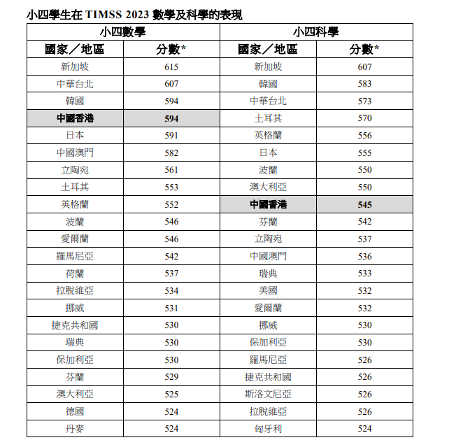 香港新聞網12月4日電 香港特區政府教育局發言人4日表示,當日公佈的國際數學與科學趨勢研究(TIMSS)2023結果顯示,香港學生的整體成績遠高於國際平均水平,表現出色。 TIMSS 2023由國際教育成就評價協會主辦,每四年進行一次,目的是研究第四年級(相等於香港小四年級)及第八年級(相等於香港中二年級)的學生在數學和科學的表現,超過60個國家或地區參與。