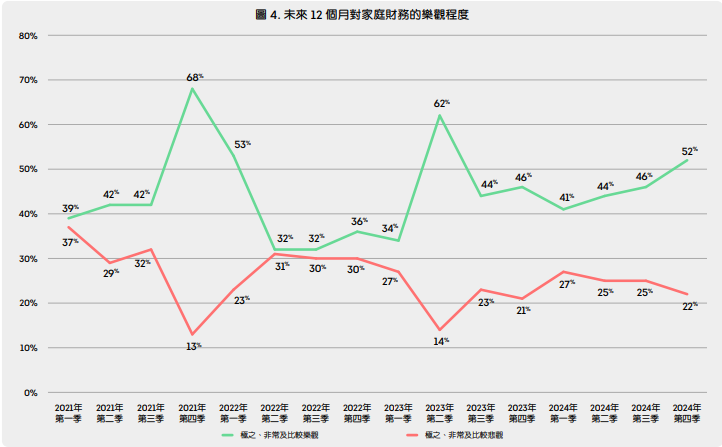 (截圖自2024年第四季消費者脈搏) 環聯於今年9月25日至10月5日期間,對1000名居住在香港的18歲或以上成人進行調查。 調查顯示,今年第四季,34%香港消費者表示家庭收入在過去三個月有所增加。縱觀受訪的各年齡層,49%的Z世代(出生於1995年至2004年)表示收入增加,為各年齡層中比例最高的一群;40%的千禧世代亦指收入增加,為2023年第四季以來的最高比率,反映千禧世代收入顯著改善。第四季,52%受訪者表示收入維持平穩。 消費者對收入前景亦持樂觀展望,44%的消費者預期來年收入會上升,42%的消費者預期收入將維持穩定。這種樂觀情緒在年輕世代更為顯著,當中51%的千禧世代預期收入會增加,較去年同期的40%大幅上升;53%的Z世代亦對收入增長感到樂觀。 調查顯示,約52%受訪者對明年的家庭財務狀況感到樂觀,高於去年第四季的46%。報告認為,改善可能受惠於香港股票市場表現向好、經濟活動增加等。 另外,雖然41%消費者對大額消費持審慎態度,但隨着節日假期臨近,33%消費者預期未來3個月會增加外出用餐、旅遊和娛樂等非必要支出,反映香港消費者的消費信心將持續至年終零售旺季。 環聯亞太區研究與諮詢首席顧問孫威瀚表示,最新調查揭示,香港消費者對家庭財務狀況及前景感到樂觀。由於他們對目前及未來所預期的收入均反應正面,消費者越來越有信心維持財務穩健,特別是年輕世代。(完) 【編輯:劉春】