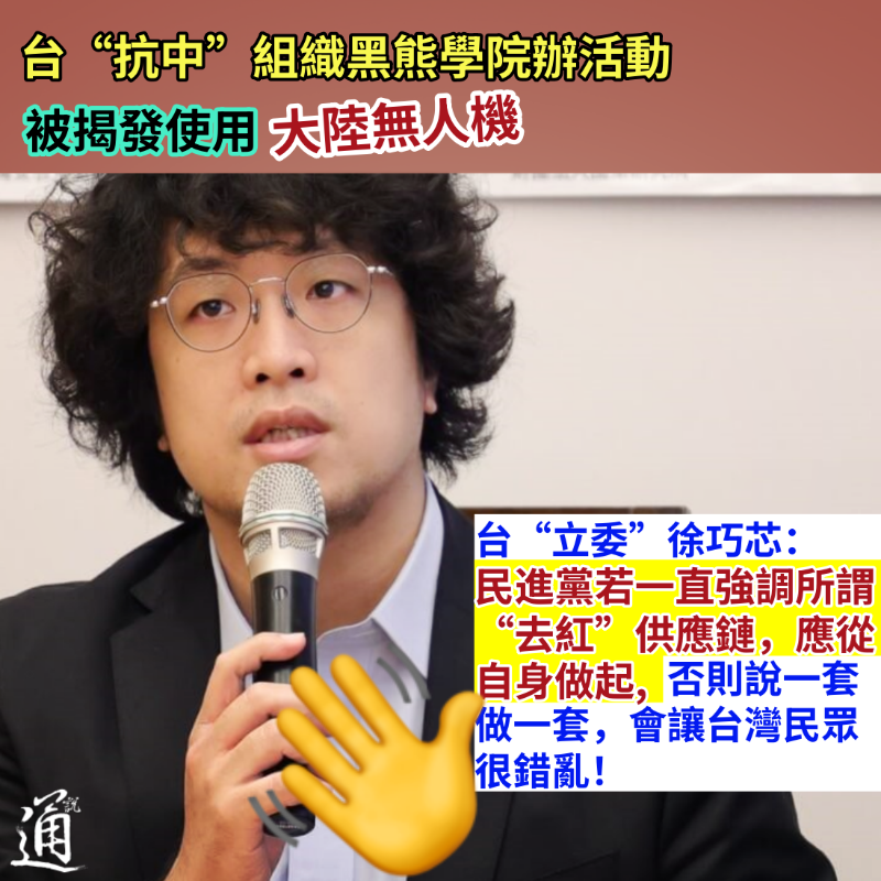 針對黑熊學院將有關責任推給承包商,徐巧芯認為,這種心虛式的作法讓大家看到黑熊學院真實的一面。她也留意到,民進黨“立委”吳思瑤戴的麥克風,也是大疆的。質疑若民進黨一直強調所謂“去紅”供應鏈,是不是應該從自身做起?否則說一套、做一套,會讓台灣民眾很錯亂。