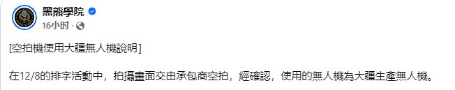黑熊學院8日在台北華山藝文園區舉辦所謂千人排字活動,並用無人機進行航拍。尷尬的是,卻被揭發使用的無人機為大陸品牌。對此,黑熊學院12日晚間在社交平台臉書發文回應稱,在8日的排字活動中,拍攝畫面交由承包商航拍,經確認,使用的無人機為大陸品牌——大疆。帖文還聲稱,“錯的事情絕對會虛心檢討”。