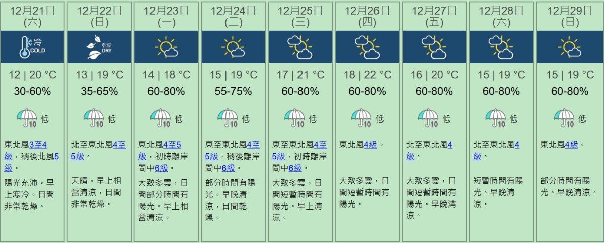 香港九天天氣預報 天文台 本港今日陽光充沛。早上天氣寒冷。日間非常乾燥,最高氣溫約20度。吹和緩東北風,稍後轉吹清勁北風。明日天晴及非常乾燥,市區早上相當清涼,新界仍然寒冷,日夜溫差頗大。下周初早晚仍然清涼,聖誕節假期雲量較多。 天文台指,季候風補充會在下周初至中期持續影響廣東,沿岸早晚天氣仍然清涼。同時,預料一個低壓區會橫過南海南部,與其相關的雲帶會覆蓋南海及廣東沿岸。而另一股東北季候風會在下周後期影響華南。(完) 【編輯:王少喆】