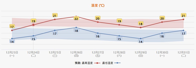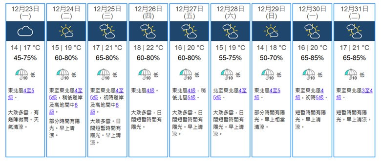 香港地區未來9天氣溫預報。香港天文台截圖 香港地區今日(23日)天氣預測:大致多雲,有幾陣微雨。天氣清涼,最高氣溫約17度。吹和緩至清勁東北風。預計,平安夜(24日)早上仍然清涼,晚上風勢較大。聖誕節假期短暫時間有陽光,日間和暖。本週後期再度轉涼。(完) 【編輯:豐悅】