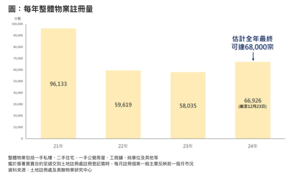 香港新聞網12月25日電   據香港美聯物業研究中心綜合土地註冊處資料顯示,2024年(截至12月23日)香港整體物業(包括一手私樓、二手住宅、一手公營房屋、工商舖、純車位及其他等)註冊量合共錄66,926宗,超越2023年全年58,035宗的歷史低位,並高出約15.3%,同時亦較2022年59,619宗高出約12.3%,創3年新高!