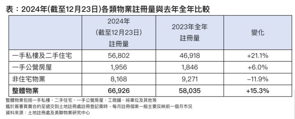 據資料顯示,在不包括一手公營房屋之下,今年(截至12月23日)香港一手私樓及二手住宅註冊量合共錄56,802宗,比起2023年全年46,918宗高出約21.1%;至於一手公營房屋方面,年內錄1,956宗,較2023年全年輕微高出約6%。