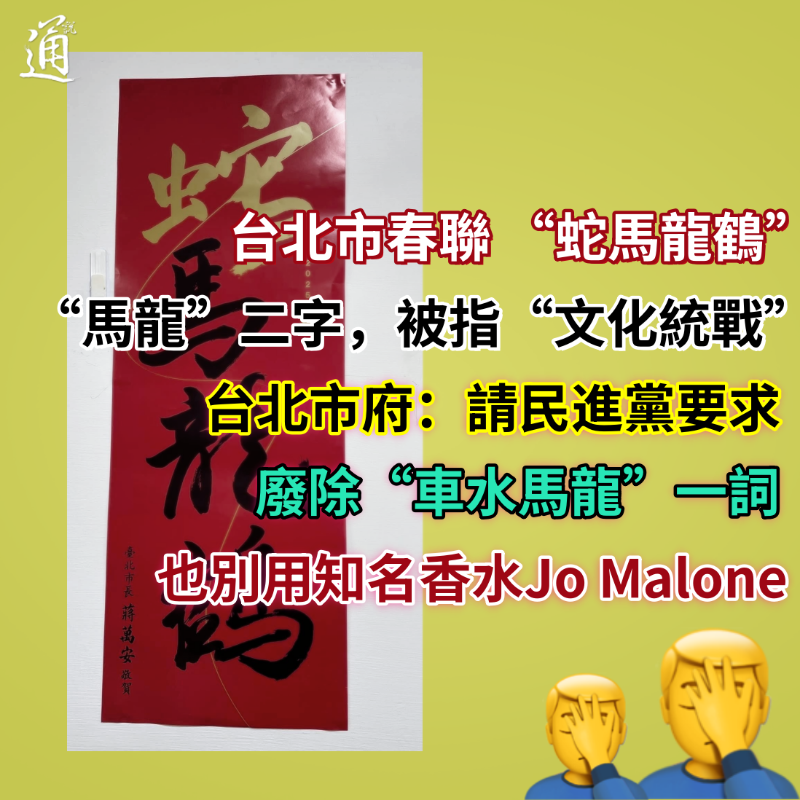 (圖源:游淑慧臉書) 未料,這竟讓民進黨破防了? 民進黨議員陳怡君質疑,台北市春聯以“蛇馬龍鶴”為題,不僅捧“馬(英九)”,又偷渡大陸球員“馬龍”的名字,“蔣萬安團隊根本是諧音哽玩到走火入魔”,把馬屁文化拍到極致。又揚言有關春聯藏著“文化統戰”的味道,面對一天到晚對台灣“文攻武嚇”的大陸,“蛇馬龍鶴”的春聯,台灣人貼的下去嗎? 用公帑暗捧大陸選手,台灣台北真能萬安? 早前,馬英九基金會邀請7所大陸高校師生赴台參訪,成員包括馬龍等,在台灣掀起“馬龍旋風”。當時,民進黨中已有不少人吃味,宣稱大陸師生團意在“統戰”台灣。如今,一副春聯也能上綱上線…… 針對民進黨議員的刁難,台北市府副發言人郭音蘭回應指,照議員邏輯,請議員即刻要求台教育部門辭典廢除“車水馬龍”一詞,而且也不要用知名香水Jo Malone(祖馬龍)。另外,建議議員也可以呼籲美國知名藝人 Post Malone及NBA退休籃球名將 Karl Malone立刻到美國民政機關辦理改名手續。 “原來最思念馬龍的人是她。”面對民進黨議員的腦洞大開,台北市議員游淑慧在社交平台臉書發出靈魂拷問: “那怡君議員為何不善意解讀,這是萬安市長向他前兩任台北市長:馬英九、郝龍斌致敬,也能說得通啊。” “其實就是玩個諧音梗,希望結合明年的生肖,祝福所有的台北市民明年什麼都好。” 游淑慧揶揄陳怡君要“以君子之心,度君子之腹”。