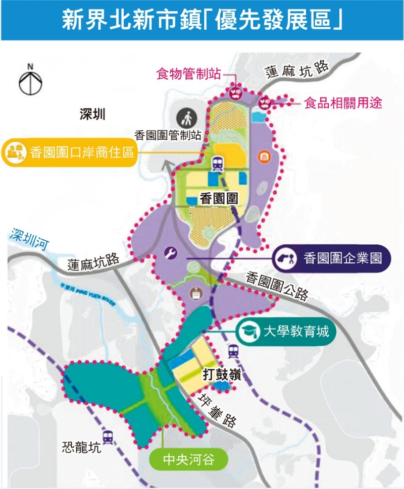 由於新界北新市鎮屬北部都會區中面積最大,香港特區政府將先行發展佔地206公頃的“優先發展區”,包括香園圍口岸商住區、香園圍企業園及大學教育城。