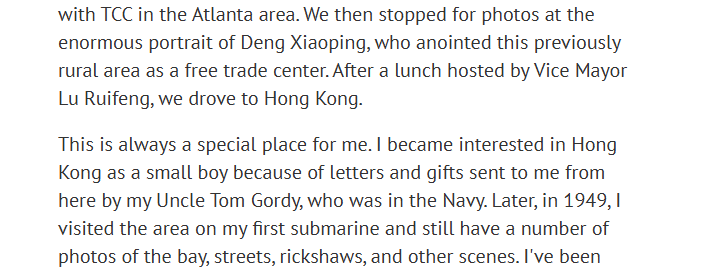 摘自2011年卡特工作日記(圖源:卡特中心) “這(香港)對我來說一直是一個特別的地方。我從小就對香港產生了興趣,因為我的叔叔湯姆·戈迪(Tom Gordy)從這里寄來了信件和禮物,他在海軍服役。後來,在 1949 年,我乘坐我的第一艘潛艇訪問了該地區,至今仍有許多海灣、街道、人力車和其他場景的照片。” 據卡特回憶,香港的繁忙港口、鱗次櫛比的高樓,以及中西文化交融的獨特氛圍令他驚嘆不已。特別是在維多利亞港的游船夜宴上,他深刻感受到香港的活力與包容性。他在日記中寫道:“香港是一座橋樑,連接著東西方的文化,也連接著人們的心靈。”這一評價,後來被無數香港人引為驕傲。 與香港的情緣不斷 1979年,卡特總統成為首位正式承認中華人民共和國的美國總統,在中美關係史上留下了濃墨重彩的一筆。 卸任總統後,卡特於1982年創立了卡特中心(The Carter Center),致力於全球疾病防治、選舉監督和人道主義援助。卡特與香港的關係也在這一時期進入了新的階段。