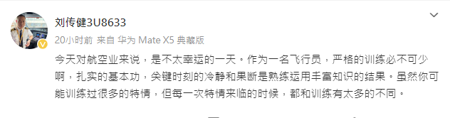 劉傳健在微博留言。微博截圖。 劉傳健表示,“今天對航空業來說,是不太幸運的一天。作為一名飛行員,嚴格的訓練必不可少啊,扎實的基本功,關鍵時刻的冷靜和果斷是熟練運用豐富知識的結果。雖然你可能訓練過很多的特情(特殊情況),但每一次特情來臨的時候,都和訓練有太多的不同。”