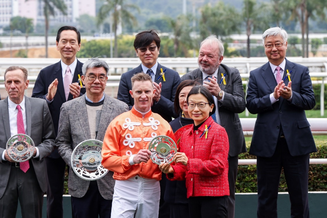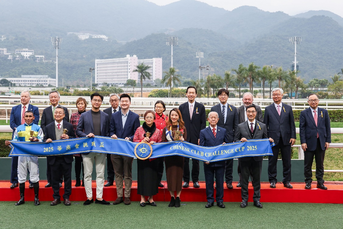 香港賽馬會董事馮婉眉(第一排右)頒發獎盃及銀碟予頭馬“嫡愛心”的騎師潘頓、練馬師蔡約翰及馬主老友鬼鬼團體代表 另一場焦點賽事為第八場的華商會挑戰盃讓賽,途程為1400米。此場賽事競爭十分激烈,最終由呂健威訓練、田泰安策騎的“手機錶霸”力壓亞軍“飛鷹翱翔”勝出。