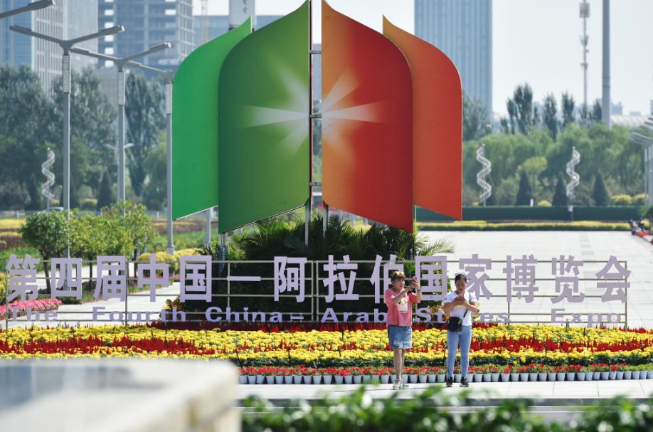 2019年9月4日,遊客在第四屆中國-阿拉伯國家博覽會的會標前拍照。新華社資料圖
