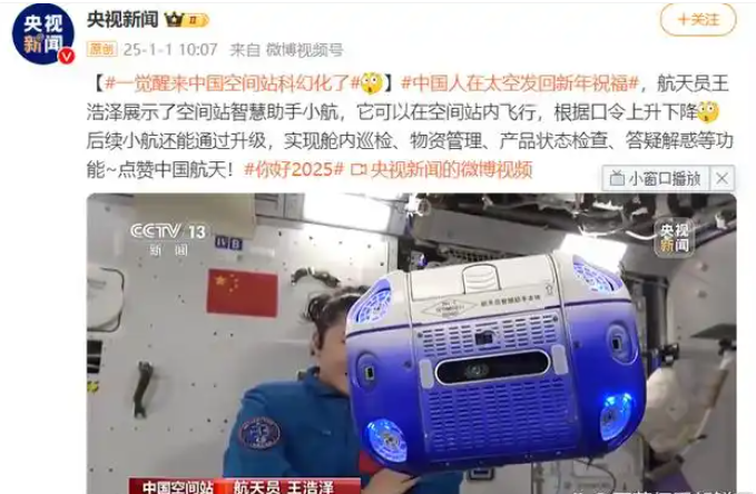 图源:央视新闻。 據央視報道,這款無需遙控器的智能助手可通過語音指令完成空間站內的任務。作為中國首台空間站艙內智能飛行機器人,標誌著中國航天智能化邁出重要一步。 據悉,“小航”入駐空間站旨在替代、協助航天員在空間站內移動拍照、艙內巡檢、物資管理產品狀態檢查、答疑解惑與航天員情感互動等。未來還將升級更多功能。 (完) 【編輯:錢林霞】