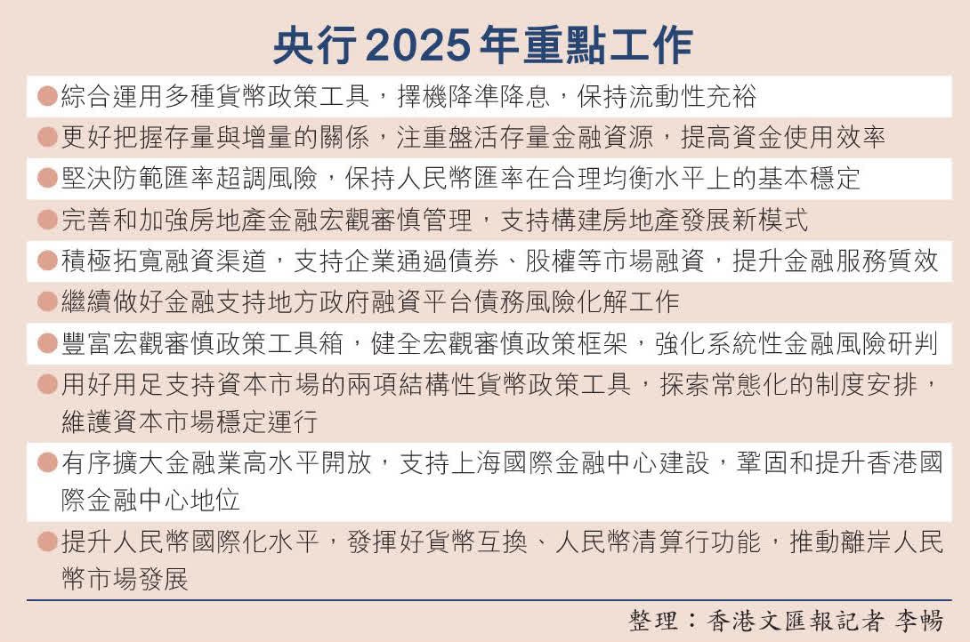 香港新聞網1月5日電  據中國人民銀行官網消息,2025年中國人民銀行工作會議1月3日至4日召開,總結2024年工作,分析當前形勢,部署2025年工作。會議強調,要實施適度寬鬆的貨幣政策,擇機降準降息,保持流動性充裕、金融總量穩定增長。更好把握存量與增量的關係,注重盤活存量金融資源,提高資金使用效率。用好用足支持資本市場的兩項結構性貨幣政策工具,探索常態化的制度安排,維護資本市場穩定運行。