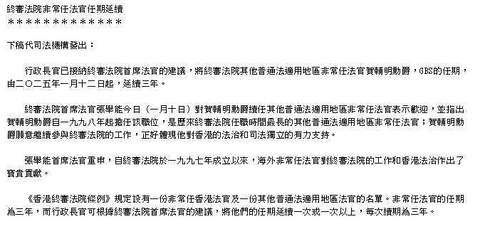 張舉能對賀輔明勳爵續任表示歡迎,並指出賀輔明勳爵自1998年起擔任該職位,是歷來終審法院任職時間最長的其他普通法適用地區非常任法官;賀輔明勳爵願意繼續參與終審法院的工作,正好體現他對香港的法治和司法獨立的有力支持。 張舉能重申,自終審法院於1997年成立以來,海外非常任法官對終審法院的工作和香港法治作出了寶貴貢獻。 《香港終審法院條例》規定設有一份非常任香港法官及一份其他普通法適用地區法官的名單。非常任法官的任期為三年,而行政長官可根據終審法院首席法官的建議,將他們的任期延續一次或一次以上,每次續期為三年。 香港作為中國唯一的普通法司法管轄區,歷來有從世界各地招聘法官的傳統,這不僅彰顯了城市法治的包容性,更被視為對城市法治建設信心的有力證明。 但自2020年以來,香港司法界便頻現海外非常任法官離職的現象。尤其是2022年,英國更是撤換了其在香港最高法院的院長與副院長。 去年,兩名來自英國的香港終審法院非常任法官亦提出辭呈,引起外界關注。 香港律政司副司長張國鈞曾稱,留意到近年一些國家,特別是英美給予法官政治壓力。他強調司法機構的法官及香港法律制度仍維持非常優良表現,希望海外政客不要再嘗試攻擊或破壞香港法治。 行政長官李家超早前亦強調,海外非常任法官制度會延續下去,運作也沒有問題。 李家超指出,在任或因不同理由離開香港的海外法官,對於香港制度和香港法官獨立審判有信心。強調香港司法制度非常透明。(完) 【編輯:劉春】