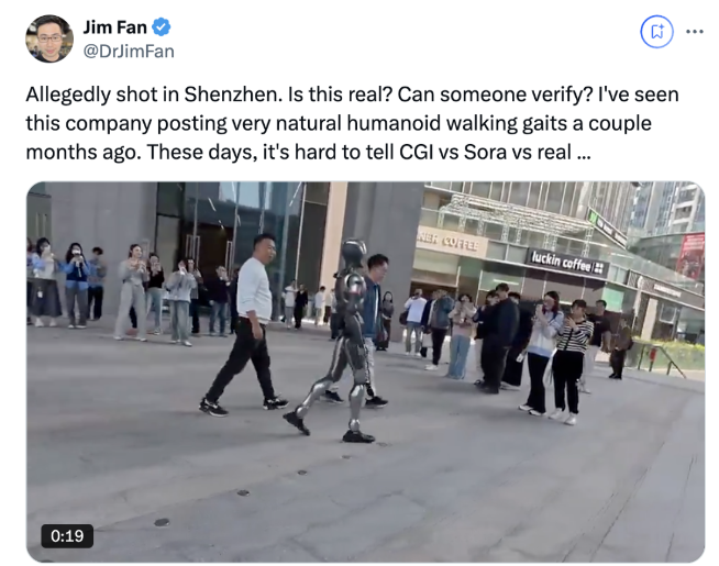英偉達科學家Jim Fan看了都有點懷疑自己的眼睛:這到底是真實的還是Sora合成啊……