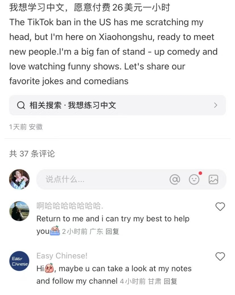 學中文、做菜及交流愛好……美國“TikTok難民”湧入小紅書做了這些!香港新聞網1月17日電 這兩天,大量美國網友湧入中國社交應用小紅書的新聞刷屏網絡。從學中文、學做菜到小眾愛好分享,美國網友與中國網友熱絡互動,兩地文化實現深度交流碰撞。 作為根植於中國本土、中文用戶為主的APP,美國網友學習中文的熱情被瞬間點燃。網上某語言學習平台發布數據顯示,2024年12月1日至2025年1月13日期間,美國的普通話學習人數較2024年同期飆升近2.16倍。