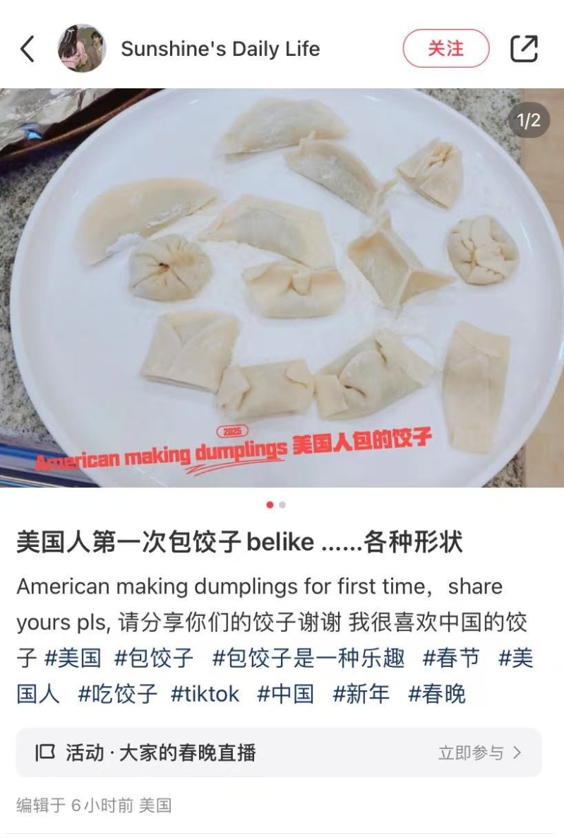 美食永遠是拉近人與人距離的最好方式。不少美國網友好奇中國民眾的一日三餐,紛紛發帖詢問中國人平時吃什麼。大家熱情地曬出自己的餐桌,更邀請他們有機會一定要來嘗嘗。 不少美國網友想要學習製作中國傳統食物如餃子、餛飩等,在小紅書上發帖尋找教程,其中執行力滿分的更是火速上手實踐,包出來的餃子有模有樣。
