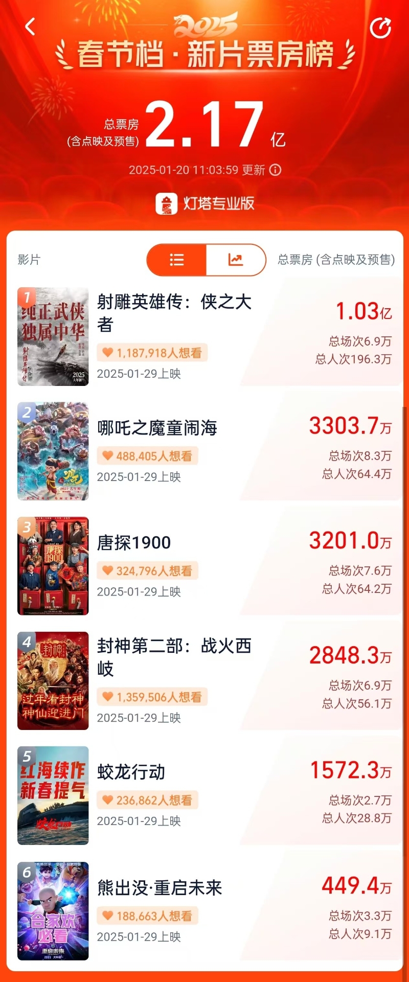 截至當日11時,2025年春節檔預售總票房已達2.17億元,除“射雕”破億外,《哪吒之魔童鬧海》《唐探1900》也已預售突破3000萬元,《封神第二部:戰火西岐》預計也將在今日突破3000萬元。(完)