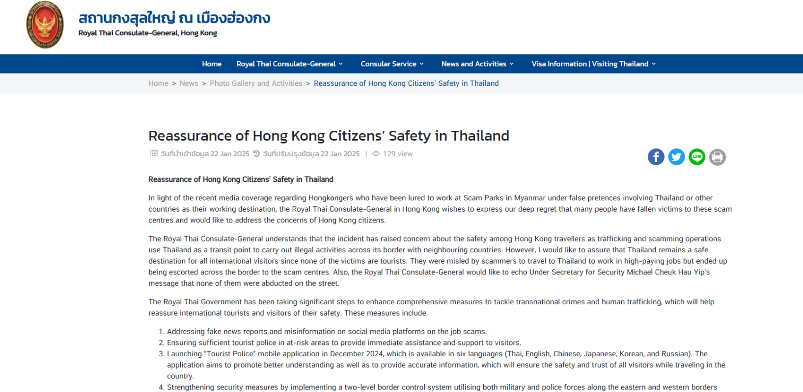 泰國駐香港總領事館22日晚間就發出聲明表示,泰國政府一直在采取步驟加強打擊跨國犯罪和人口販運的綜合措施,泰國總領事館亦已張貼警告橫幅,提醒香港旅客或在泰國尋找工作的人士聯絡總領事館核實。