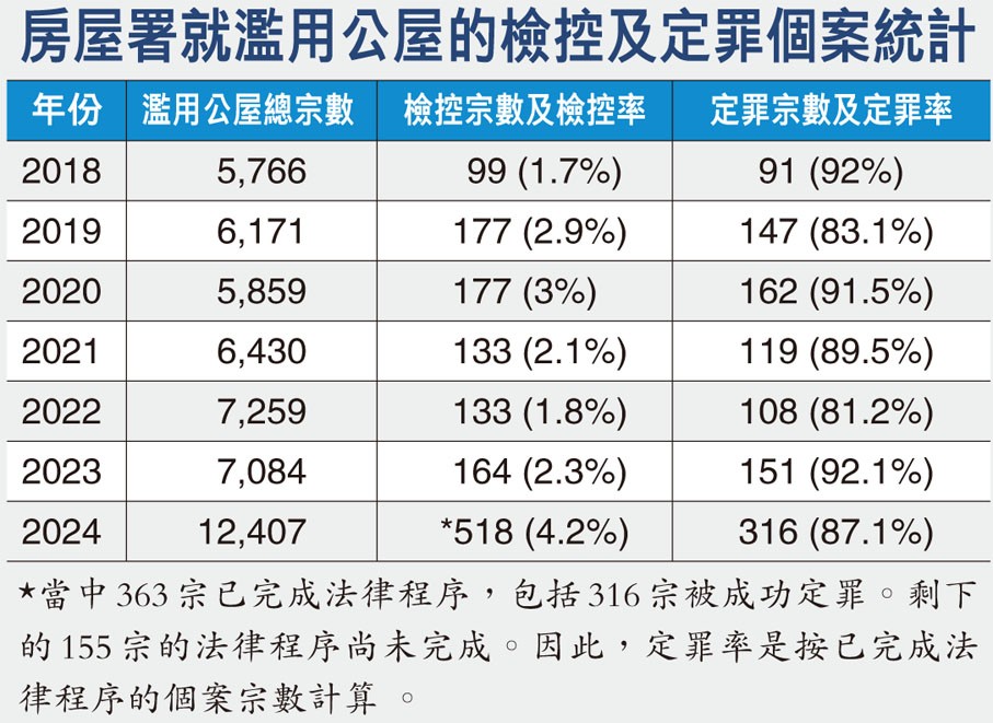 據香港文匯報圖片 去年檢控率僅4.2% 有改善空間 陳積志表示,現屆政府在2022年7月上任以來,房屋署已合共收回逾7,000個被濫用及違反租約條款的單位,“總數比一個大型屋邨的單位總和還要多。”但公署認為有關工作仍有改善空間,以去年為例,房署揭發超過12,000宗濫用公屋個案,僅500多宗被檢控,佔整體4.2%,這已是7年來最高紀錄,當中不少嚴重違規個案因超出兩年檢控時限,最終只是收回單位了事。公署建議房委會應該全面檢討如何在檢控時效內發現及蒐集足夠證據作出檢控,以提高檢控率及入罪率。 公署抽取房委會其中9宗濫用個案調查,發現大部分濫用單位住戶,例如把單位非法轉租或虛報資產,非經常持續在單位居住,結果只是被收回單位,沒有被檢控。其中,2023年房屋署善資組收到網上舉報,稱有人在網上出租平台出租屋邨單位,經調查後鎖定涉事單位,再向入境處、運輸署等相關政府部門索取戶主資料後,發現戶主由2019年7月1日至2023年7月12日的1,473天當中,有1,220天(82.82%)不在香港,其間將單位非法轉租。 公署高級調查主任陳利婷表示,房署曾在不同時間突擊查訪該單位。2023年8月22日,房署發出遷出通知書遭戶主上訴,最終上訴失敗,歷時5個月才收回單位,戶主最終亦未被檢控。她分析,案中大廈保安員無就不同陌生人士進出該單位的舉報紀錄,若非有人在網上發現並舉報,該濫用行為不知何時才能被揭發。“多次家訪無人應門、電話號碼顯示無人登記,其實都是濫用公屋的徵兆。如果屋邨辦事處查核戶主出入境紀錄,應該可以發現戶主已不在港居住,更早收回單位。” 倡“富戶政策”涵蓋所有出租屋邨 另外,亦有租戶自2008年起至少5次提交不正確的申報表,隱瞞擁有物業,包括同時持有兩個商舖及一個住宅,但就算申報表資料不齊、明顯有可疑,但屋邨辦事處職員照樣接納。陳利婷說:“這宗個案反映個別的屋邨辦事處人員沒妥善跟進申報表,包括適時跟進申報表遞交時間,以及認真仔細審核申報內容。” 申訴專員公署向房委會及房協提出31項改善建議,包括探討與內地建立渠道以獲取租戶是否擁有內地或澳門特區物業資料;將“富戶政策”涵蓋所有出租屋邨的租戶、檢討周期性家訪的安排、與土地註冊處建立核對機制、加強刑罰等。公屋住戶每兩年要申報有否擁有本地物業,公署提醒要嚴格審核申報表,發現有可疑,可以及早跟進和調查。(完) 【編輯:王少喆】