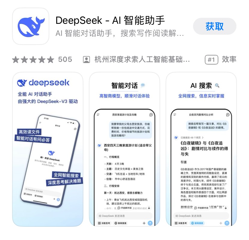 中國新AI大模型DeepSeek登頂美國APP排行榜分享到: