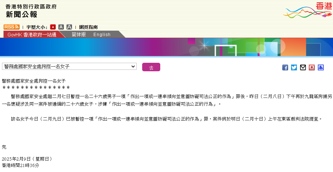 香港新聞網2月9日電 香港警務處國家安全處9日表示,繼7日暫控一名26歲男子一項“作出一項或一連串傾向並意圖妨礙司法公正的作為”罪後,8日下午再於九龍區拘捕另一名懷疑涉及同一案件被通緝的26歲女子,涉嫌“作出一項或一連串傾向並意圖妨礙司法公正的行為”。