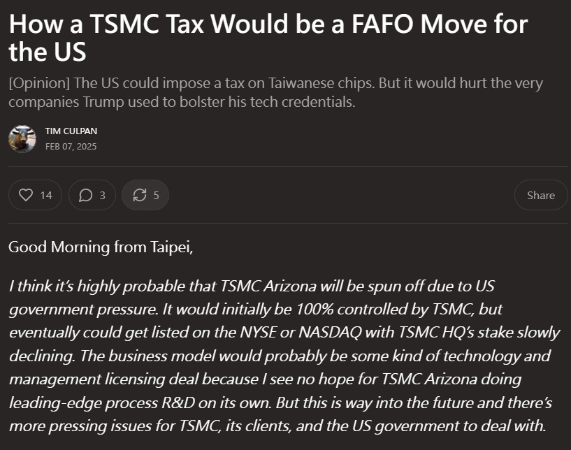 高燦鳴(Tim Culpan)在個人新聞平台Culpium發文。 知名科技記者高燦鳴(Tim Culpan)在個人新聞平台Culpium發文稱,特朗普威脅對台灣半導體課徵關稅可能是要求台積電在美進行更多投資談判的手段,而台積電亞利桑那廠迫於美國政府壓力,最終可能會在美國上市,該廠目前由台積電100%控制,但未來台積電總部的持股將逐漸減少,可能以某種技術和管理許可協議的形式進行。高燦鳴批評說,美國並沒有足夠的實力全部使用美國生產的芯片,台產芯片的地位無法取代,此舉“不僅荒唐,還將衝擊美國在AI領域的競爭力”。 針對特朗普的關稅威脅,台灣“經濟部”計劃派遣代表前往華盛頓,與美國官員會面,以獲取第一手信息。 美國共和黨前亞太區主席方恩格在《中國時報》撰文,指出特朗普最關心的是與主要貿易夥伴的貿易逆差。他建議台灣當局採取多項措施,如加強與特朗普溝通、增加對美武器採購、鼓勵台灣科技產業加大對美投資等,以應對徵稅威脅。 《經濟日報》報道,台積電原定於去年12月舉行亞利桑那州晶圓廠的首批晶圓交貨儀式,但因特朗普當選而延遲。專家普遍認為,特朗普的關稅威脅意在迫使台積電增加在美生產的比重,尤其是先進制程。(完) 【編輯:黃璇】