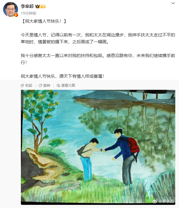 圖片來源:李家超微博帳號 他說記得有一次,自己和太太在湖邊漫步,他伸手扶太太走過不平的草地時,情景被拍攝下來,之後畫成了一幅畫。 他十分感謝太太一直以來對自己的扶持和包容,感恩沿路有她,未來彼此會繼續攜手前行。 剛剛過完“東方情人節”元宵節,今日又迎來西方情人節。香港利東街中庭已特別設置節日裝扮,12棵近4米高的粉紅桃花樹悄然屹立,附近還有巨型粉色心形拱門,寄託“有情人終成眷屬”的美好寓意。 隨著北上消費成熱潮,也有越來越多的港人選擇北上度過情人節。今年情人節恰逢周五,市民上班結束後便可與伴侶北上,在內地度過兩天一夜的假期。 香港中通社報道,交友約會公司“香港婚活”近期訪問逾460名香港情侶及夫婦,當中約兩成男士表示會北上慶祝,16%會到海外旅遊;女士方面,分別有約21%北上及22%赴海外旅遊,外遊情況較去年有所上升。 濃情蜜意正當時。情人節的“標配”之一,免不了與伴侶共享兩人時光。調查顯示,有41%男士及38%女士選擇逛街購物,三至四成的受訪者計劃花費1001至5000港元買禮物;約七成受訪者指會與伴侶外出用餐。 香港多家餐廳推出情人節優惠、限定晚餐等,港島部分餐廳的折扣更有8折,價格從每人400多港元至上千港元不等;品類則覆蓋法國菜、西班牙菜、日料、北歐菜、中餐等,十分多元。 香港市民張先生便計劃屆時約女友一起吃西餐,認為這樣“更有節日氛圍”。他預料花費會較平日高兩倍左右,並傾向於挑選小巧、精緻的飾品作禮物。 大餐有折扣,平價更不缺,兩餸飯也來參與情人節特賣。一家餐廳外貼出粉色海報,遍佈禮物盒、粉紅色心型等心動元素;海報上寫有“情人節限定”“兩餸飯買一送一”等字樣,性價比頗高。 北上慶祝,送花服務也可“南下”。 “跨境送花”的服務也十分火熱。記者瀏覽部分內地社交平台如小紅書,從深圳買花至香港的配送價格在50至150元人民幣左右,亦可選擇於口岸交收。有提供“閃送”服務的人士指,情人節當日配送早已約滿。 中通社記者查詢香港本地部分花店,一家主做線上配送鮮花的店鋪指,情人節粉紅玫瑰花束已無存貨;為應對情人節的送花潮,該店鋪還暫停了其他預定服務,情人節期間僅做節日花束,價格普遍在500港元以上。 【編輯:紀東】