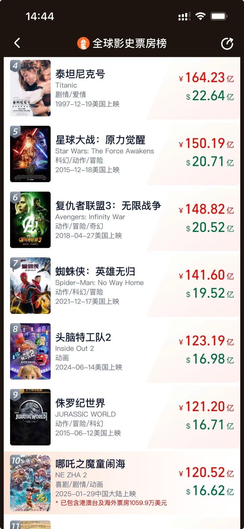 恭喜!《哪吒2》進入全球影史票房榜前十