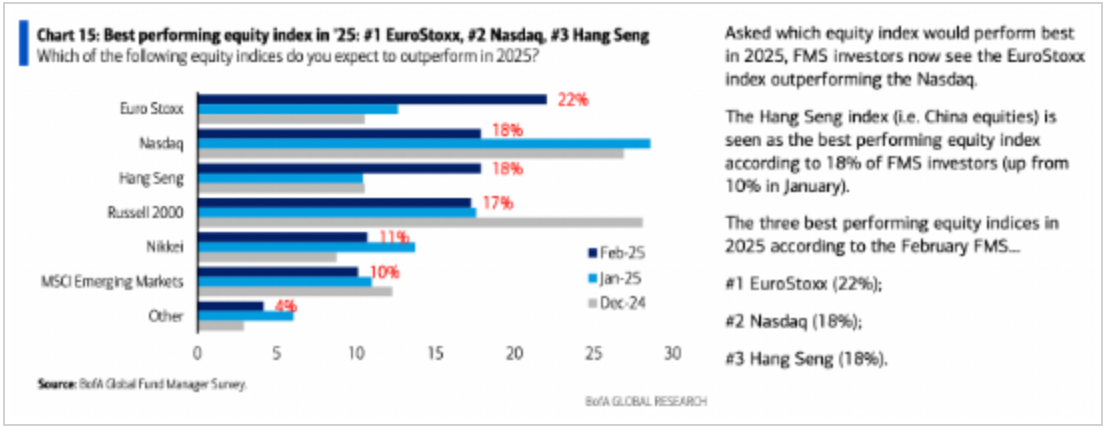香港新聞網2月20日電 根據最近對市場參與者的幾項調查,特朗普大選勝利後彌漫在美國金融市場的"特朗普交易"降溫,樂觀情緒開始減弱,這也反映了近期美股走勢弱於不少海外同行的情況。美銀本周公佈的機構調查顯示,做多美國科技股的擁擠度有所下滑,資金將目光轉向了美國本土以外,歐元區與中國資產受到了機構的青睞,美銀報告,近二成受訪者預測恒生指數2025年全球表現最佳。
