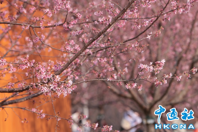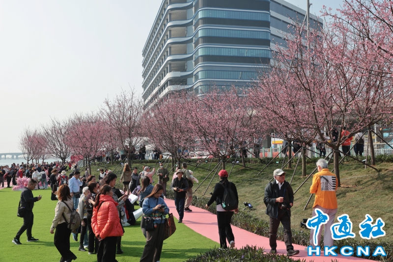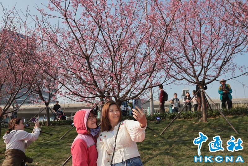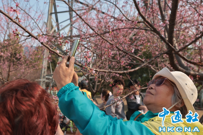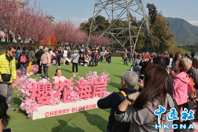 2月20日,大批香港市民和遊客在位於赤鱲角機場島的“櫻花海岸”觀賞櫻花。“櫻花海岸”在東涌灣畔種了約30棵櫻花樹,若加上旁邊的舊櫻花園,合共會有超過100棵,配上臥椅、步行道等設施,成為市民春天賞花休閒的熱門地點。(香港中通社記者 謝光磊 攝) 香港中通社圖片