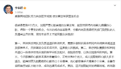 他形容為如此年幼的嬰兒進行心臟移植手術,絕對是一次醫學挑戰,香港有紀錄以來也只是第二宗。對上一宗是兩年前,4個月大女嬰芷希,同樣在獲得內地提供心臟捐贈後成功完成移植手術,他欣喜地說:“芷希目前已準備去幼兒園上學了。”(完)