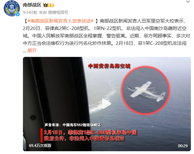 圖片來源:中國人民解放軍南部戰區微博截圖 中國人民解放軍南部戰區21日通報,2月20日,菲律賓2架C-208型機、1架N-22型機非法闖入中國南沙島礁附近空域,解放軍南部戰區全程掌握、警告驅離。2月18日,菲1架C-208型機非法闖入中國黃岩島領空,多次擅自改變飛行高度,以危險方式蓄意近距穿越中方在空正常巡邏直升機高度層,事後菲方反咬一口,誣稱中方行為“危險”。 菲方近期頻頻在南海製造不穩定因素。先是醞釀法律戰,意圖起訴“中國破壞南海環境”;後是組織“多邊海上合作活動”,與加拿大談判擬簽署部隊互訪協議;又派軍機數次闖南海,炒作抹黑中方正當維權。菲意欲何為? 南京大學中國南海研究協同創新中心高級研究員成漢平21日對香港中通社記者分析,菲律賓5月中期選舉臨近,國內政治鬥爭愈演愈烈,小馬科斯或希望將內政外交化,將自己塑造為政治強人,獲得更多民族主義分子青睞,進一步鞏固其地位。此外,菲方或從近期的俄美會談吸取教訓,為避免成為棄子,更要採取一些主動性做法,向特朗普交投名狀。 對於菲軍機擅闖南海被中方驅離,美方反應是由美國務院發聲明,批中方做法,並強調美國與“盟友”菲律賓同在,《美菲共同防禦條約》涵蓋“南海任何地點”,說辭並無新意。 成漢平認為,拜登政府承諾給予馬科斯政府大量援助,包括建設軍事基地、撥款,特朗普政府根本不可能接受,只會讓菲律賓自己掏錢。菲律賓不可能自掏腰包,手里的牌又不多,只能透過挑釁中國,獲得特朗普團隊更多青睞。 成漢平指出,特朗普目前重點的確放在俄烏,但其上台後已陸續接待以色列、日本、印度領導人,或許在小馬科斯政府看來,特朗普在下一盤大棋。即從世界各地戰略收縮,以集中精力從東西兩翼圍堵中國,菲方在南海問題上可與美方配合,提前採取行動。尤其是特朗普的執政團隊內,有不少年輕的鷹派人物,主張在南海與中國直接打熱戰,菲方或從中嗅出一些門道。 “未來南海局勢會充滿更多不確定性。”成漢平續指,一方面菲方會倒逼特朗普政府採取行動,不斷在南海挑釁中國,一方面南海問題保持熱度也符合美國利益。菲律賓國內政治鬥爭亦加劇了這種複雜性。(完) 【編輯:林曉惠】