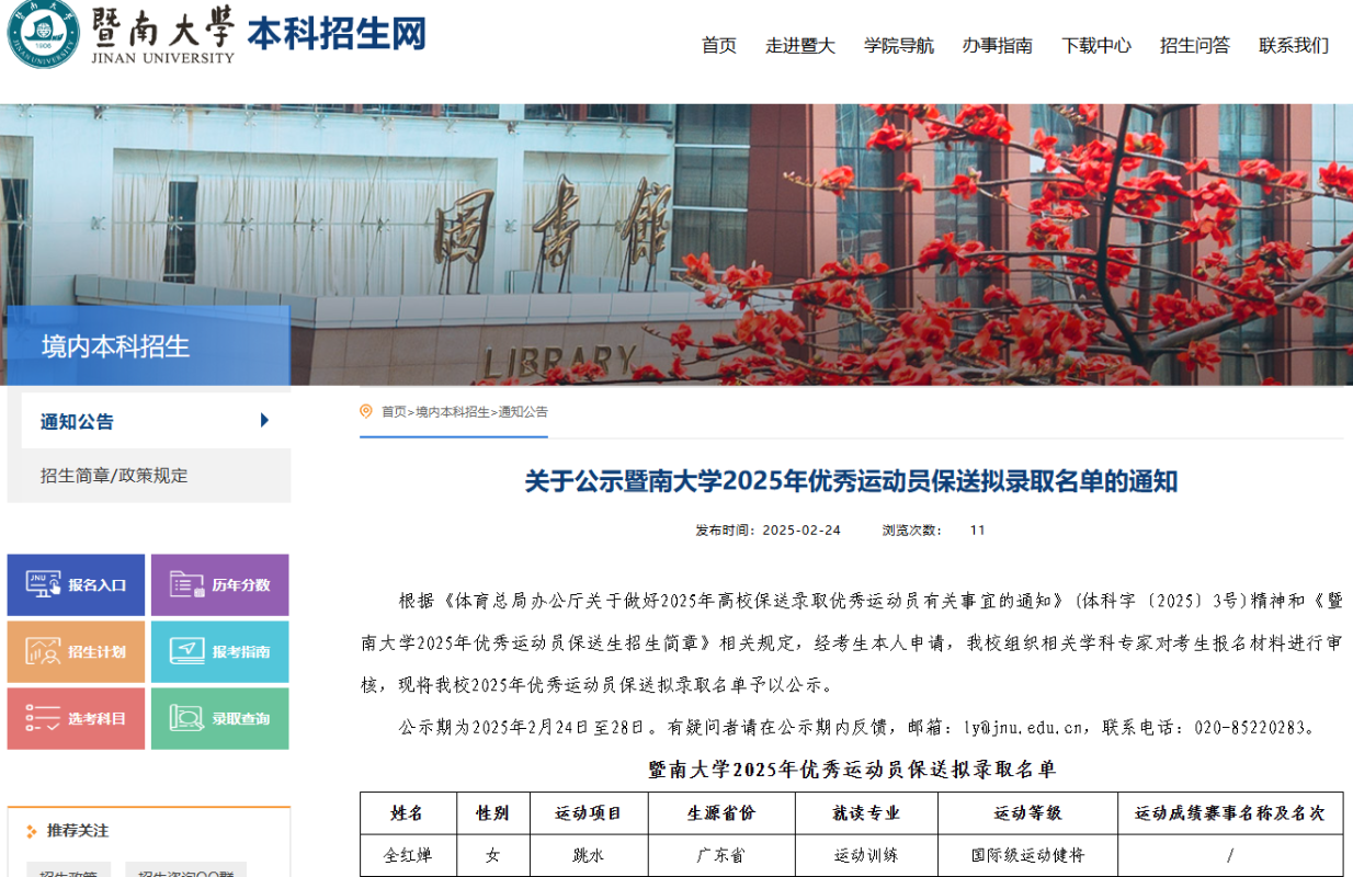 圖片來源:暨南大學本科生招生網站截圖 據《關於公示暨南大學2025年優秀運動員保送擬錄取名單的通知》顯示,經考生本人申請,暨南大學組織相關學科專家對考生報名材料進行審核,對該校2025年優秀運動員保送擬錄取名單予以公示。全紅嬋、吳嘉誠被暨南大學擬錄取 。 全紅嬋,2007年3月28日出生於廣東湛江。 去年,17歲的全紅嬋在巴黎奧運會包攬女子10米台單人和雙人冠軍,加上此前在東京奧運會女子單人10米台決賽中一戰成名,成為中國奧運歷史上最年輕的“三金王”。今年1月,世界泳聯公佈了2024年度各項目最佳運動員名單,全紅嬋當選最佳女子跳水運動員。 去年10月24日,中國全國舉重冠軍賽暨第十五屆全國運動會舉重比賽資格賽,男子61公斤級比拼中,廣州隊吳嘉誠抓舉舉起136公斤獲得抓舉金牌,並以294公斤獲得總成績銀牌。 若最終獲得保送,全紅嬋、吳嘉誠將與中國男子60米、100米亞洲紀錄保持者蘇炳添成為校友。據悉,蘇炳添為暨南大學2017屆國際經濟與貿易專業碩士研究生,同時是暨南大學體育學院副教授,碩士研究生導師。(完) 【編輯:林曉惠】