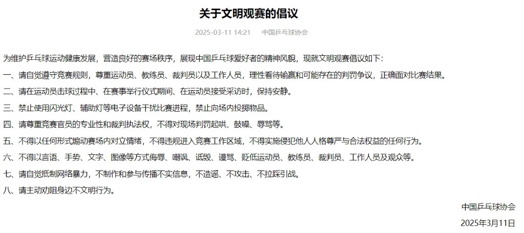 中國乒協發布文明觀賽倡議 含抵制網暴分享到: