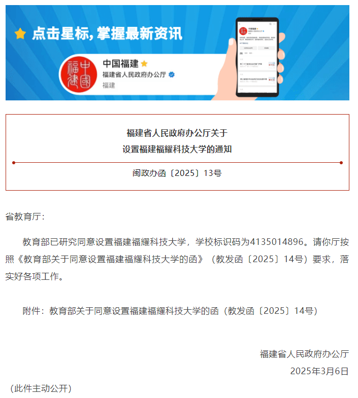 香港中通社3月11日電 中國福建省人民政府辦公廳微信公眾號“中國福建”3月11日發布消息,福建省人民政府辦公廳發布通知,教育部已研究同意設置福建福耀科技大學。