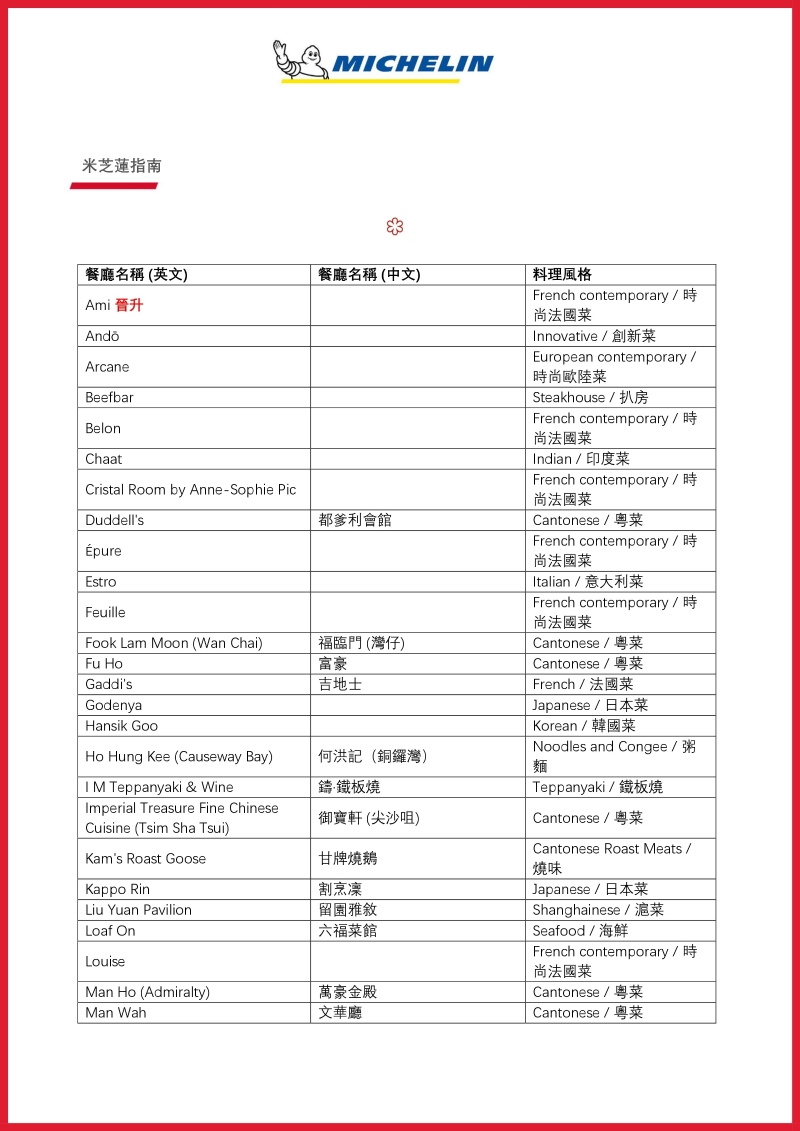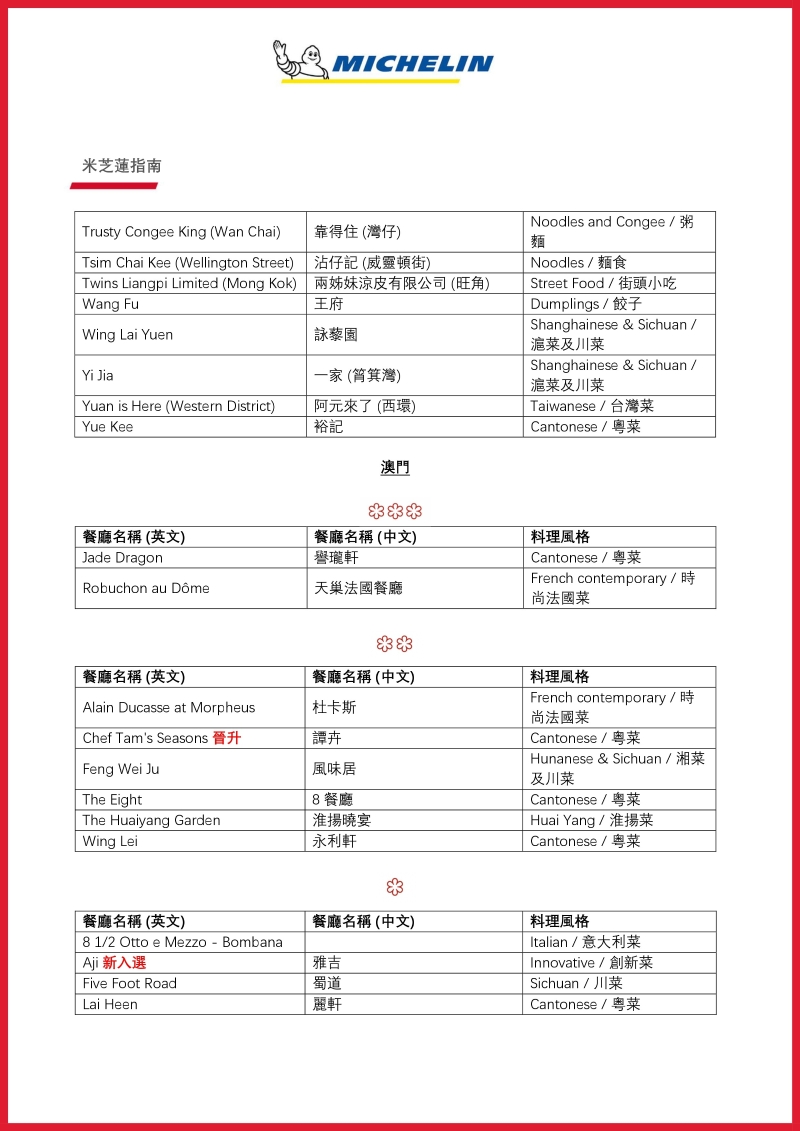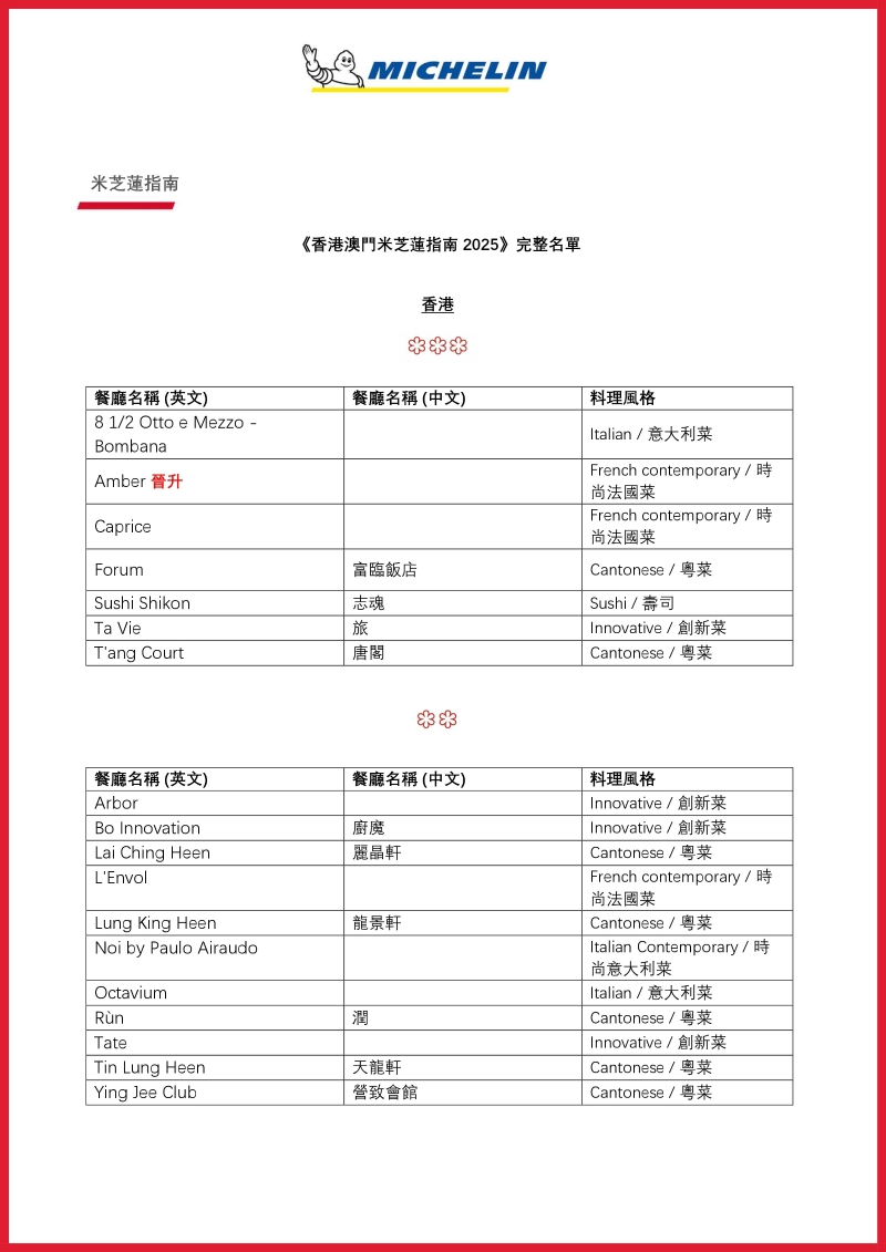 位於香港的米芝蓮三星餐廳包括:8 1/2 Otto e Mezzo – Bombana,Amber,Caprice,富臨飯店,志魂,Tavie旅以及唐閣;而澳門則包括:譽瓏軒以及天巢法國餐廳。